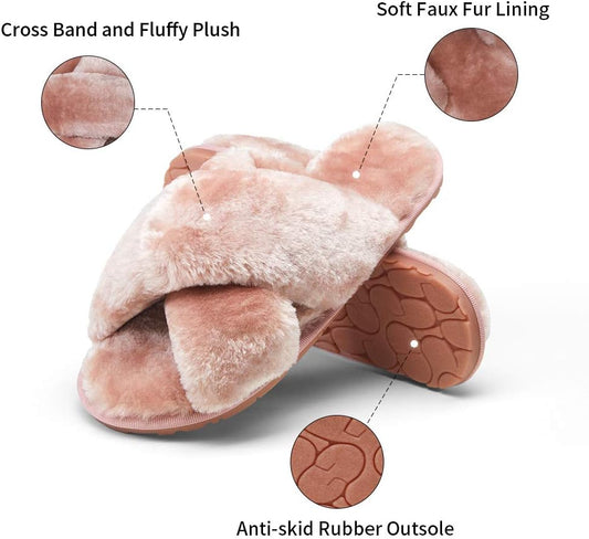 Women'S 801 Cross Band Slippers, Soft Plush Furry Open Toe Fur Slides, Fuzzy Fluffy Slip on House Shoes Indoor Outdoor Slippers
